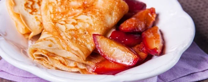 Készítsen finom palacsintát karamellizált szilvával reggeli teának vagy desszertnek.